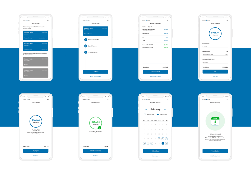 The stop-gap solution was to build a standalone responsive web app to handle the remaining payment and to reschedule the delivery when the order was ready. Comfy Couch would notify the user upfront that their backlog is severe and there is significant wait time. In addition, they would receive an email with instructions on how to pay and schedule once the order is complete and to ignore the assigned delivery date.